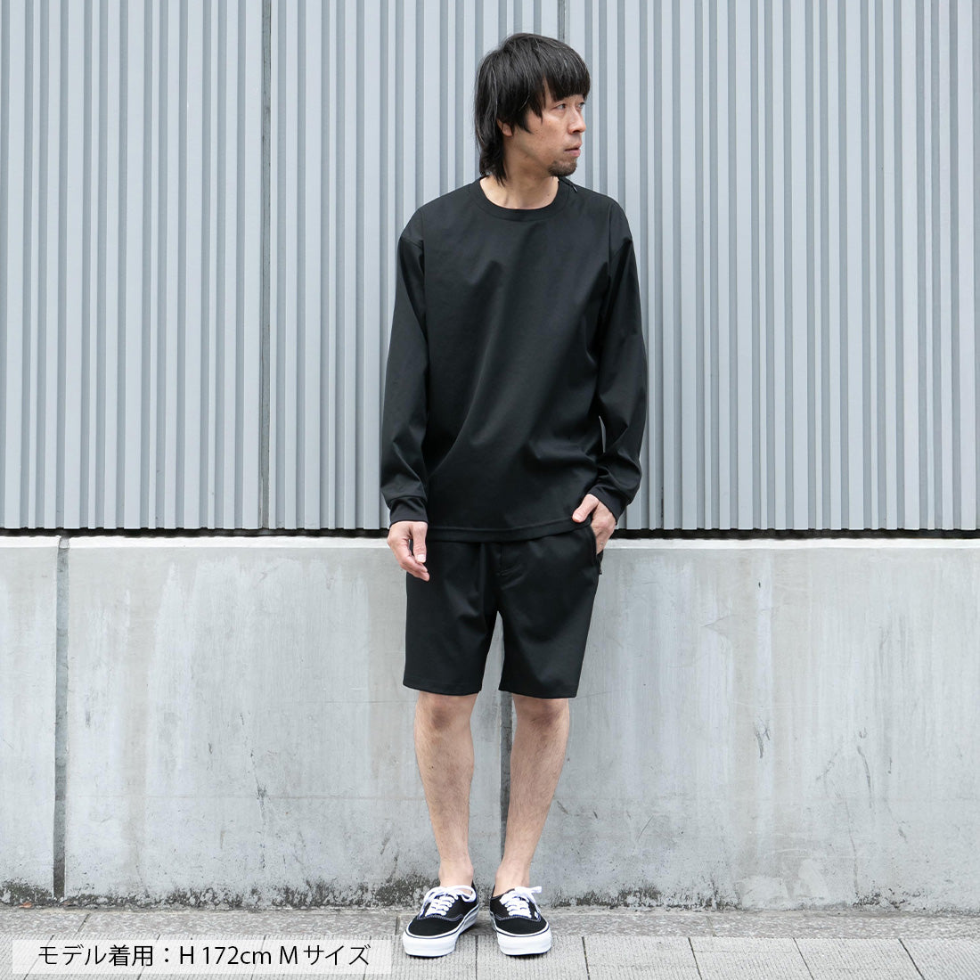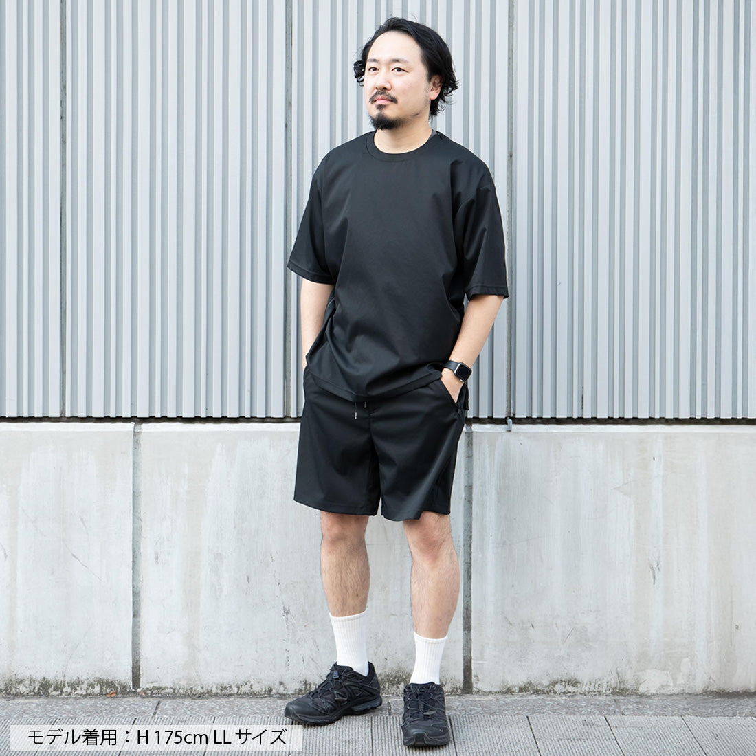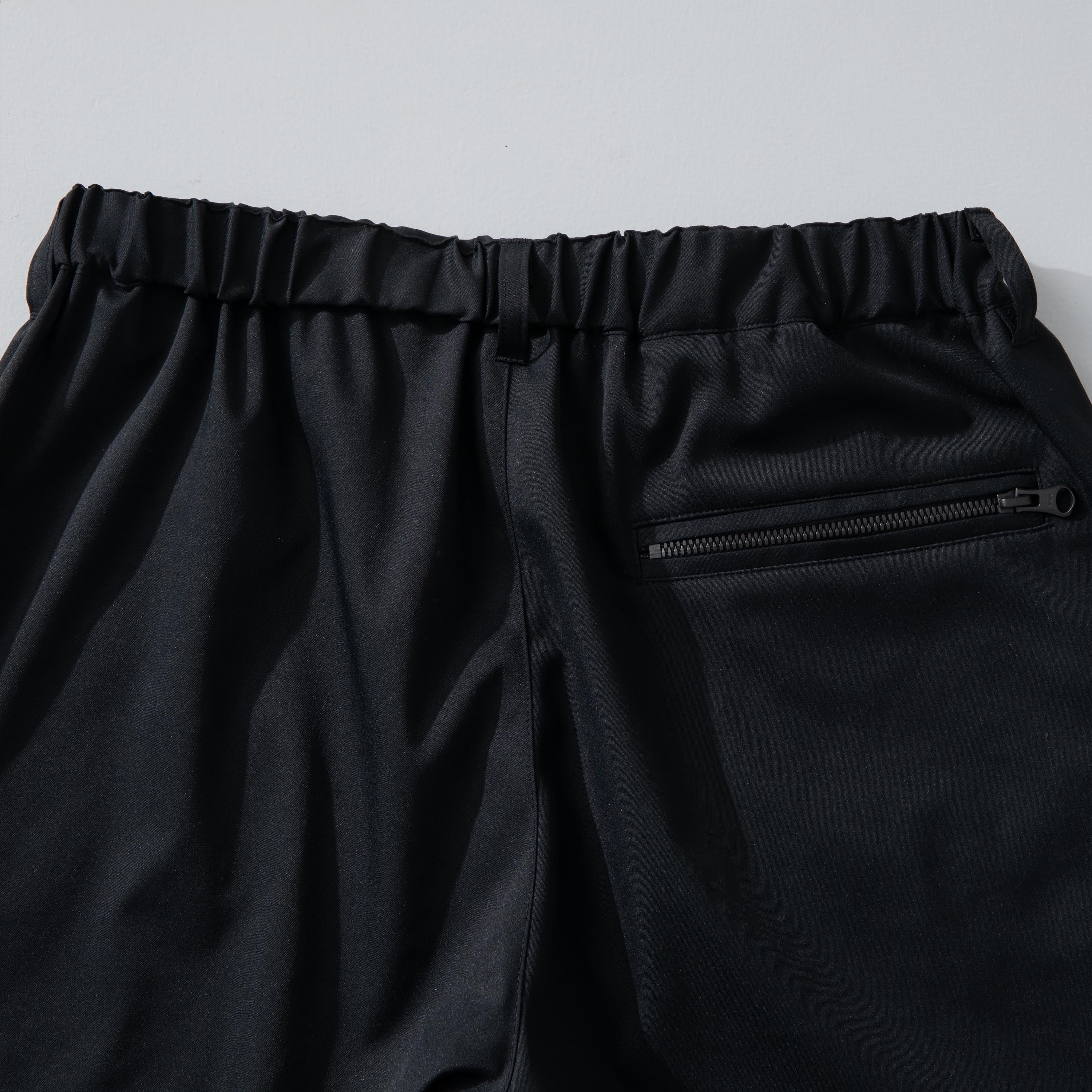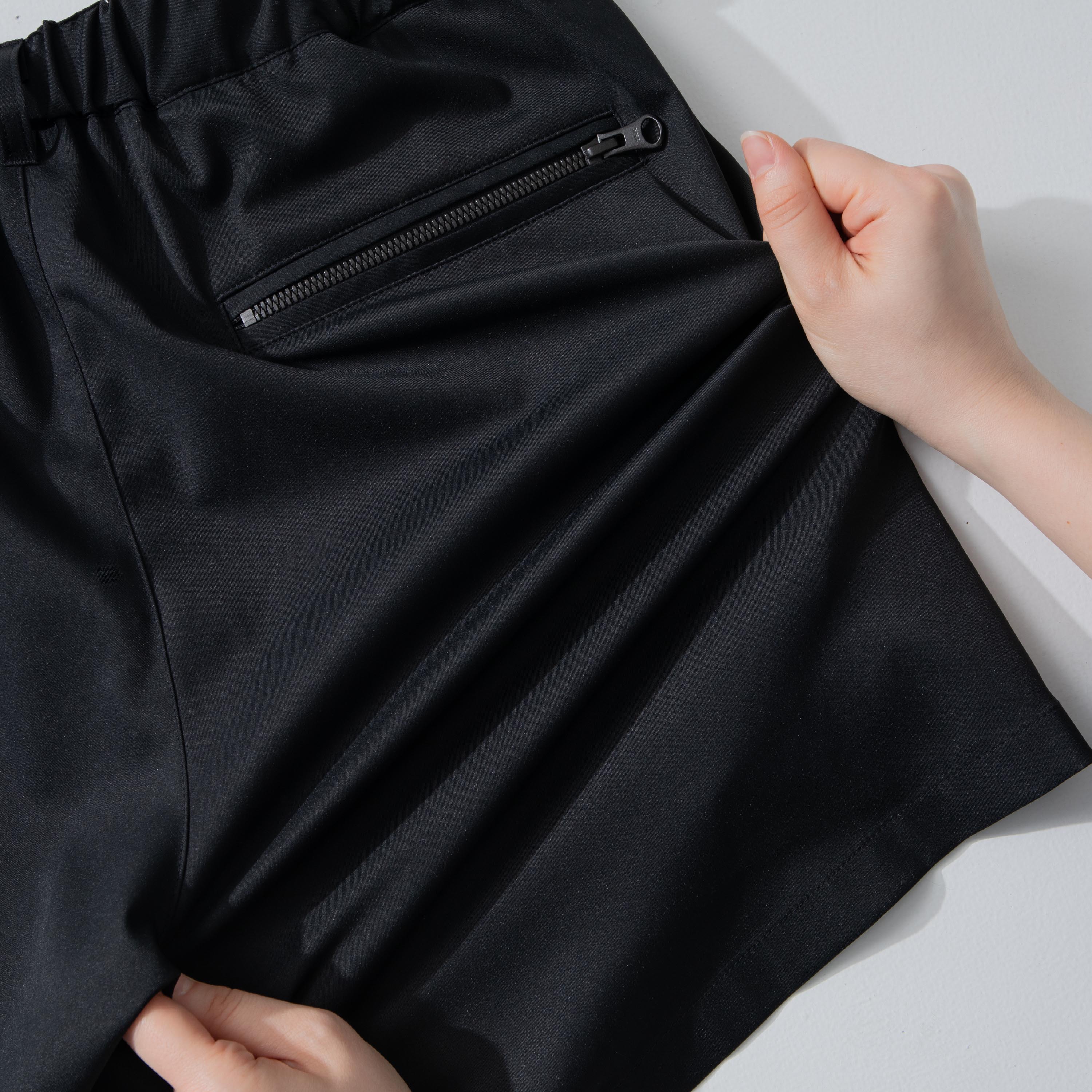 軽量かつ柔らかくてサラリとした肌触りに。暑い時期でもムレにくく、撥水機能で突然の雨でも安心です。両ポケットをメタリックファスナーにすることで、カジュアル過ぎない大人の印象を与えます。ややゆとりのあるサイズ感に仕上げました。ウエストのドローコードは内側でも外側でも結べる仕様。
